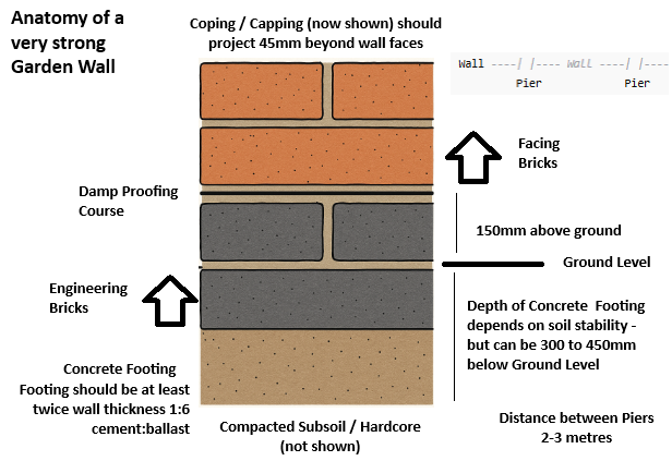 I was thinking about building a garden wall and did some investigations as to a solid construction. Here’s a diagram I put together with some notes on the composition. Note this is a consolidation of my online investigations. Similar construction would be suitable for an extension although that would involve further widening of the footing and blockwork on the inside tide to a concrete slab. I will do another post on foundations for your typical extension.
